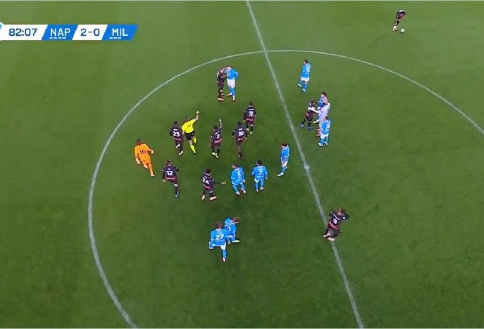 ونشبت اشتباكات بين لاعبي الفريقين في الدقيقة 81، بعد تدخل الإسكتلندي سكوت مكتوميناي لاعب فريق نابولي على الفرنسي كريستوفر نكونكو لاعب “الروسونيري”، ليتدخل حكم المباراة لتهدئة الوضع.